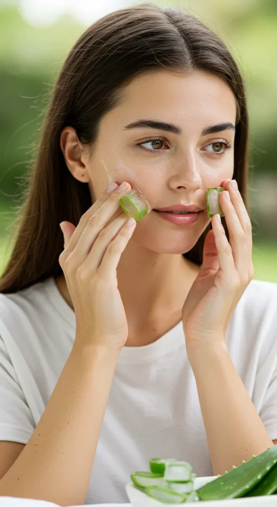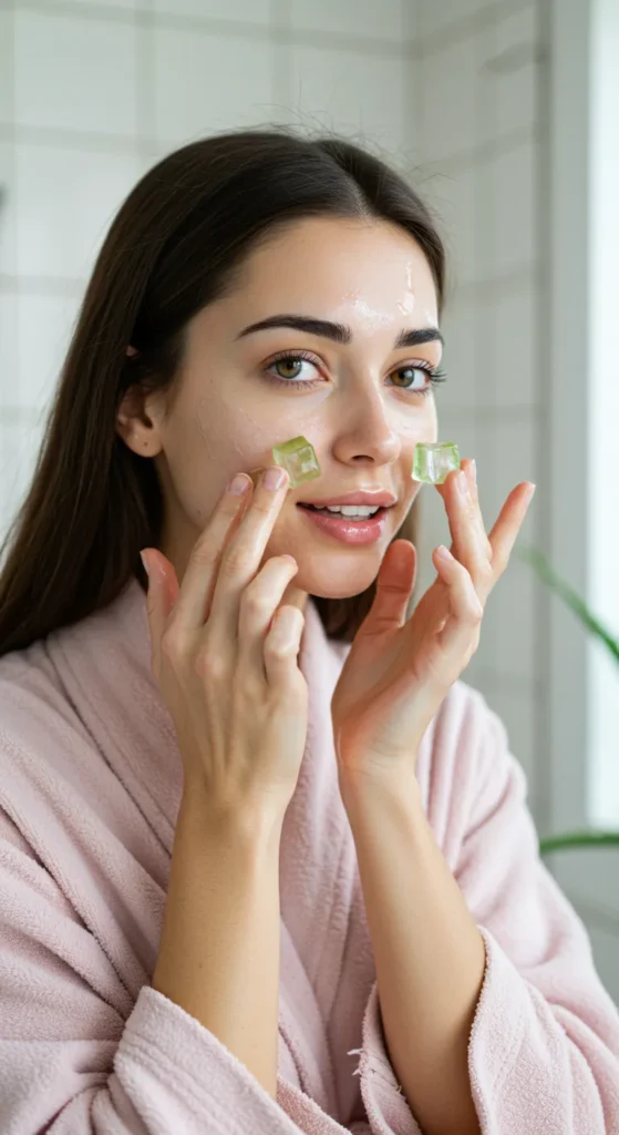 Aloe ice cubes for face are my summer obsession! I freeze aloe gel in an ice tray and glide a cube over my face. It cools, tightens pores, and reduces puffiness.