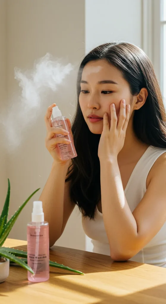 This mist is my mid-day refresh! I mix aloe vera water with rose water in a spray bottle. It hydrates, soothes, and gives my skin a dewy glow. I spritz it over makeup or bare skin.