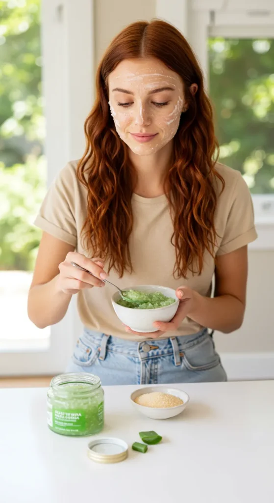 This scrub is my oily skin savior! I mix DIY aloe vera gel with sugar for a gentle exfoliator. It sloughs off dead skin and controls oil without stripping. I massage it in circles for a minute, then rinse.
