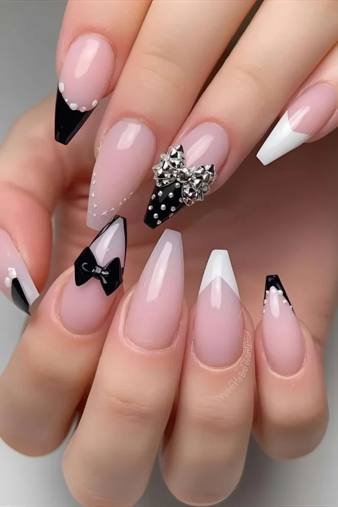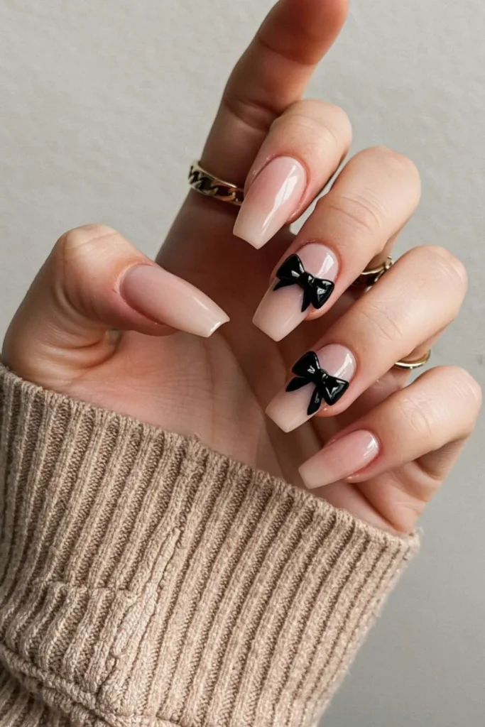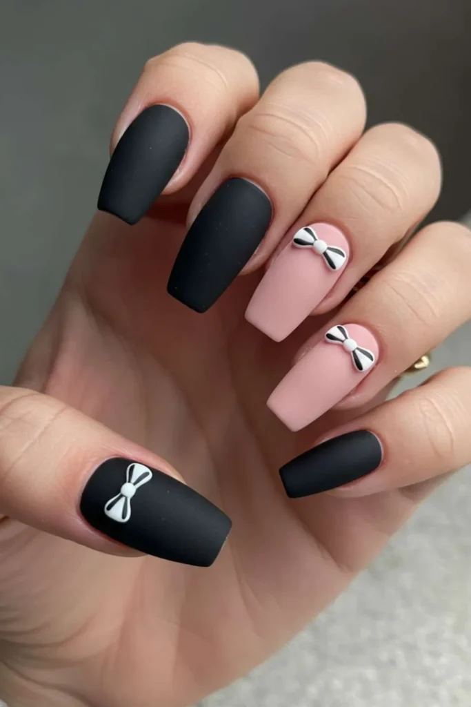 Black bow nails are edgy yet surprisingly chic. Imagine a glossy nude or matte base with one bold black bow—it’s giving classy but mysterious.