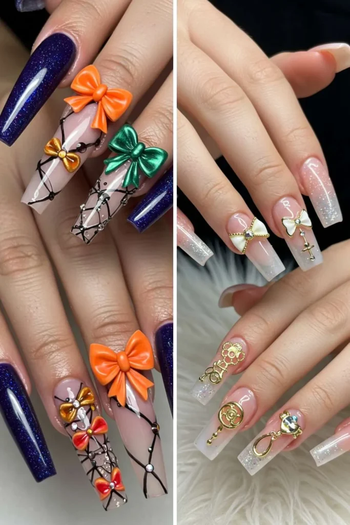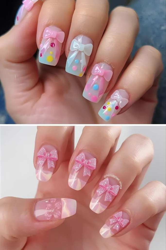 Acrylic bow nails are the go-to if you love long, bold, and dramatic designs. The acrylic base gives you the perfect canvas to experiment with bows, rhinestones, and any other add-ons. Plus, they’re sturdy enough to hold 3D charms without breaking easily.