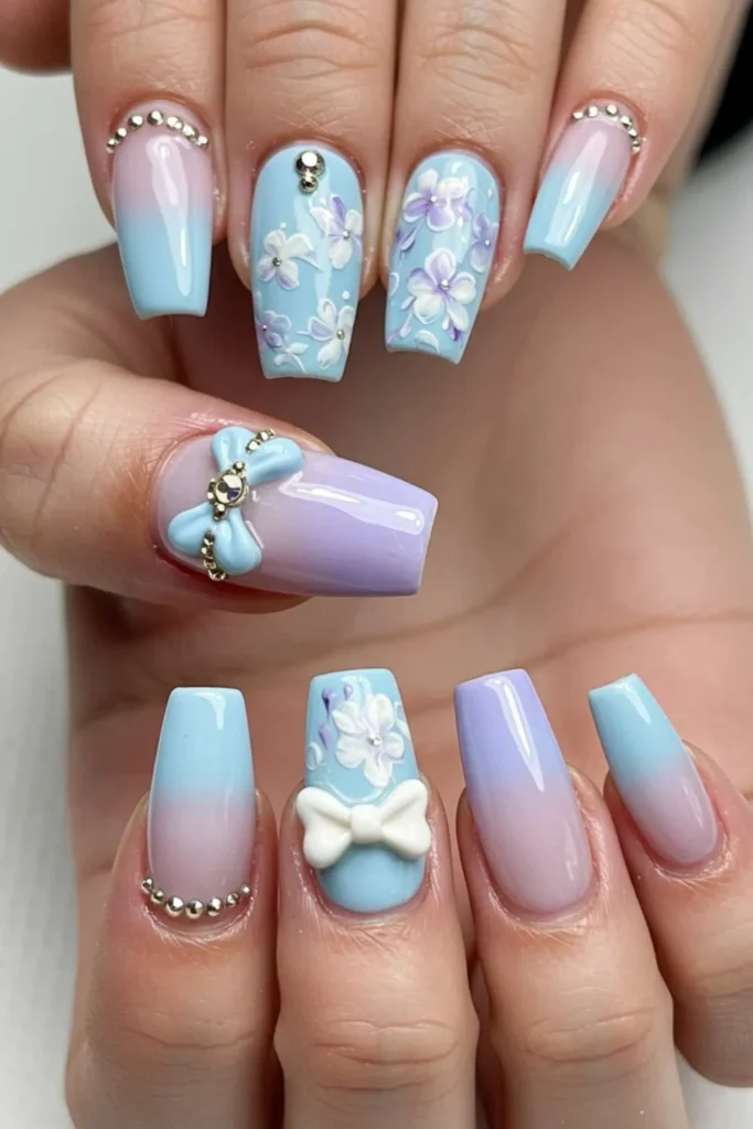 This combo feels artistic yet cute, like the perfect Pinterest “bow nail designs” pin. Ombre adds depth while bows add personality—together, they’re flawless.