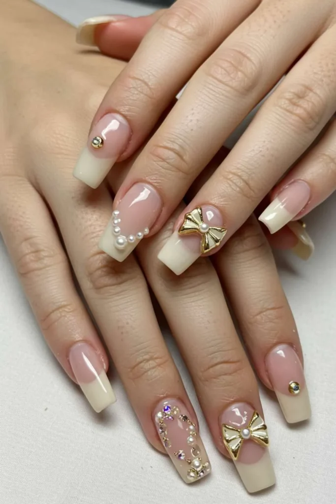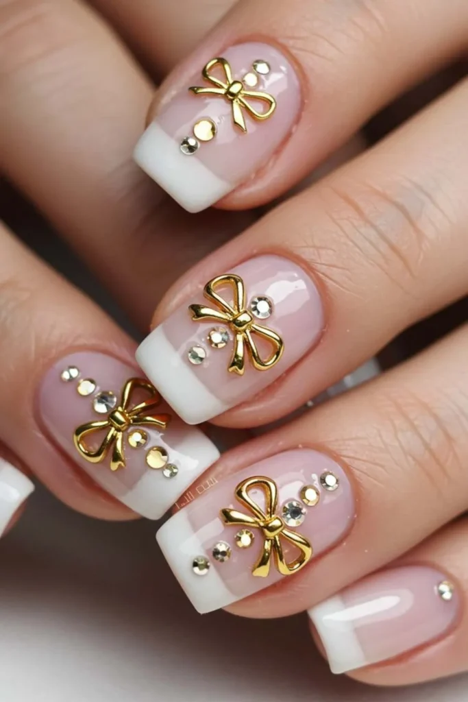 Gold bow nails are pure luxury on fingertips. A simple nude or white base paired with tiny golden bows instantly elevates your manicure. They look festive, stylish, and rich—perfect for weddings, parties, or anytime you want your nails to look like little jewels.
