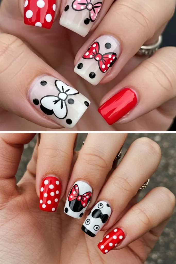 Cartoon bow nails are pure fun! Think Minnie Mouse vibes, bold reds, polka dots, or even playful pastels paired with oversized bows. They’re quirky, nostalgic, and perfect for themed parties or just showing off your playful side.