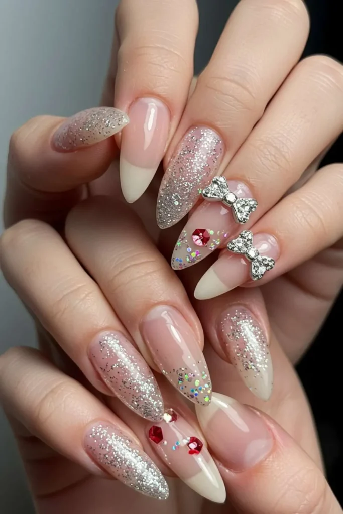 If you love sparkle, glitter bow nails are about to be your new obsession. A glittery base instantly makes your manicure party-ready, while cute bows soften the glam with a playful twist. You can go full-on glitter or just accent a few nails for balance.