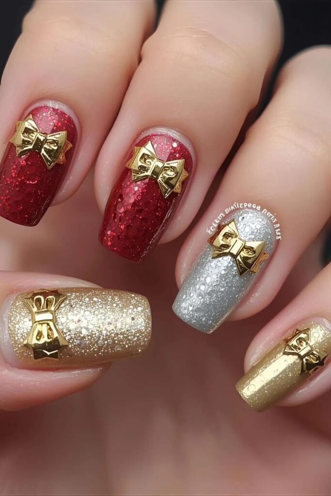 Gold bows work great on accent nails if you don’t want too much shimmer everywhere. They’re classy with just the right amount of sparkle.