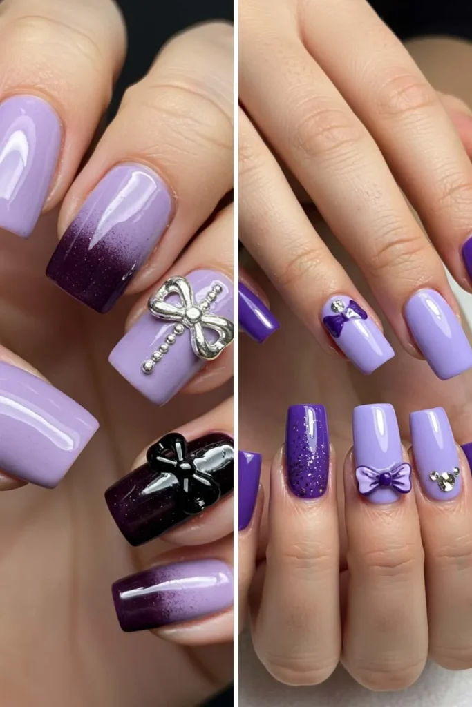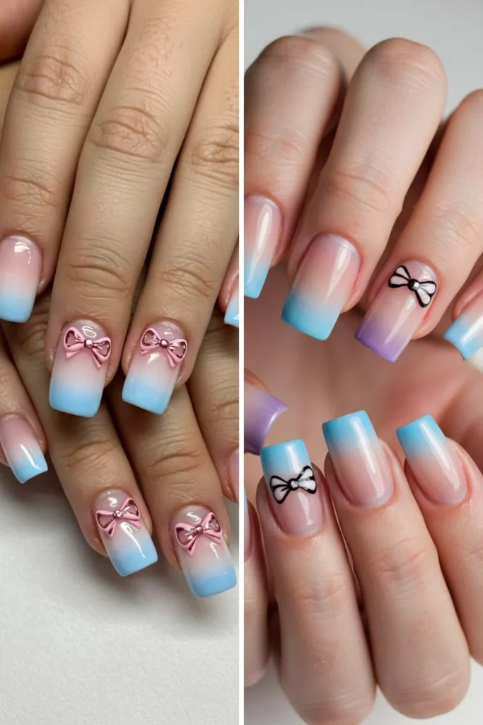 Ombre nails are stunning on their own, but bows take them to the next level. Imagine soft fades from nude to pink or bold blends like blue to purple, topped with tiny bows.