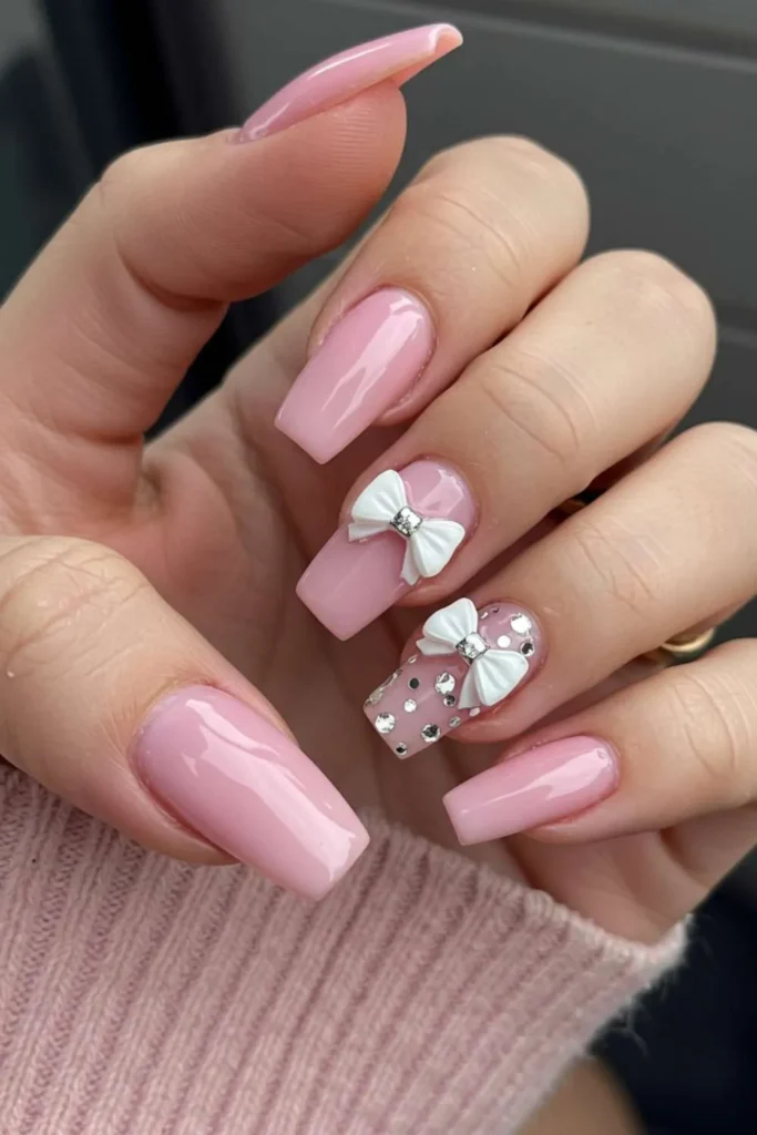 You can go pastel pink for a soft vibe or hot pink if you’re feeling bold. Add a white or silver bow detail, and suddenly your nails look like they belong in a rom-com montage.