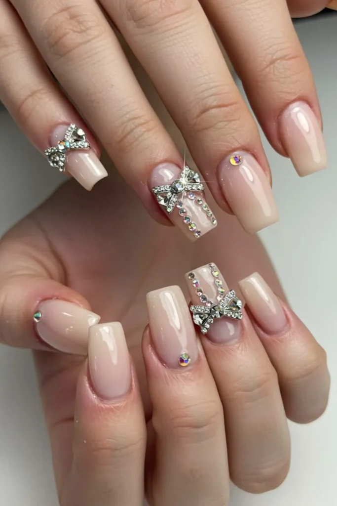 Add a little bling to your bows, and you’ve got yourself rhinestone bow nails. The rhinestones catch the light beautifully, making your nails sparkle every time you move. They pair perfectly with neutral or pastel bases so the stones really shine.