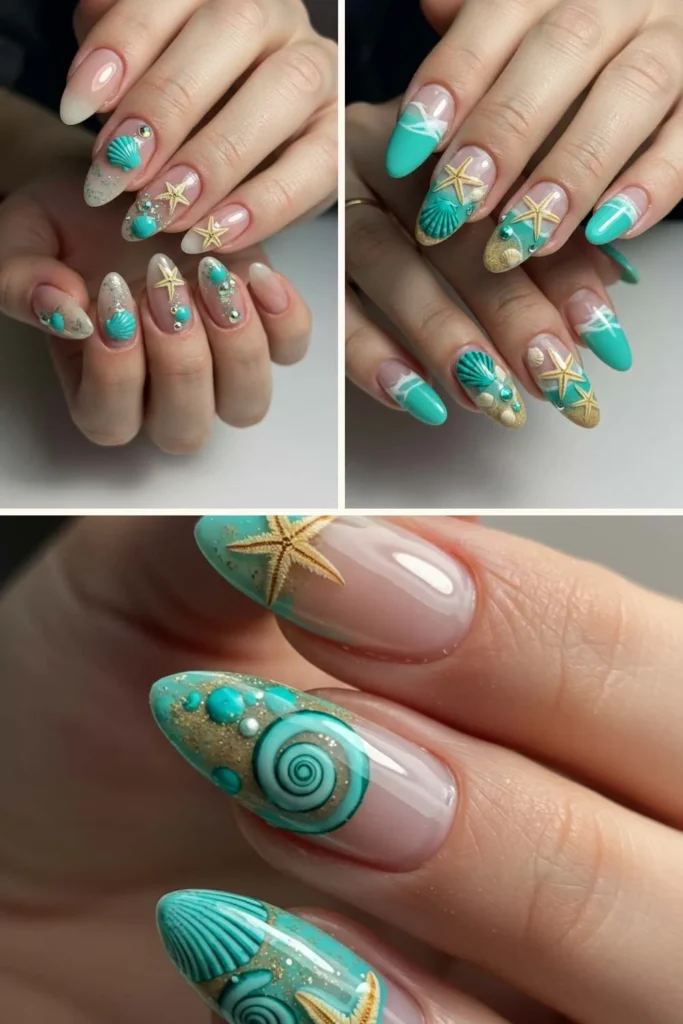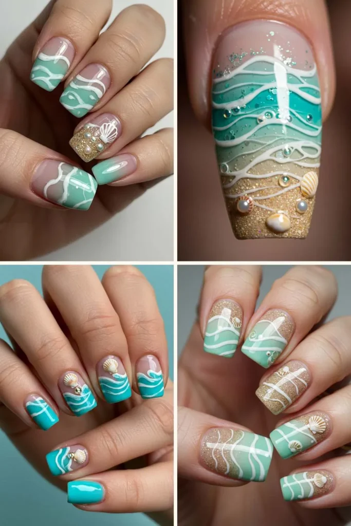 If your soul belongs to the ocean, these nails are basically made for you. Picture turquoise waves, tiny shell designs, and maybe even a sprinkle of fine glitter to mimic sand.