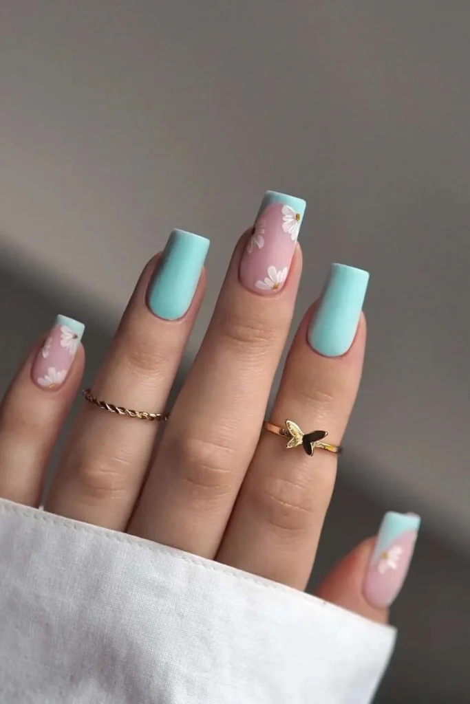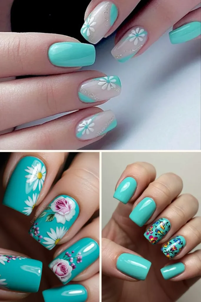 I personally love it on square or almond nails, and if you’re feeling bold, you can make the tips extra thick for a bolder statement.5. Floral Accents on Turquoise Base