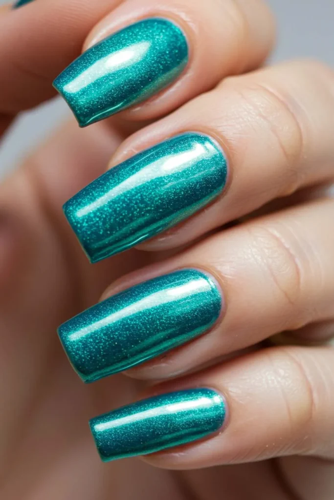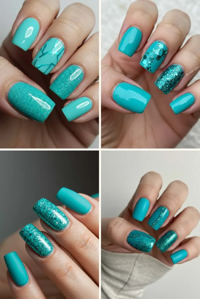 Who says you need long nails to make a statement? Short square turquoise nails are clean, chic, and low maintenance. They’re practical for everyday wear but still pop with color. If you want to add a twist, try a glossy turquoise with one matte accent nail or add a tiny glitter stripe near the cuticle.