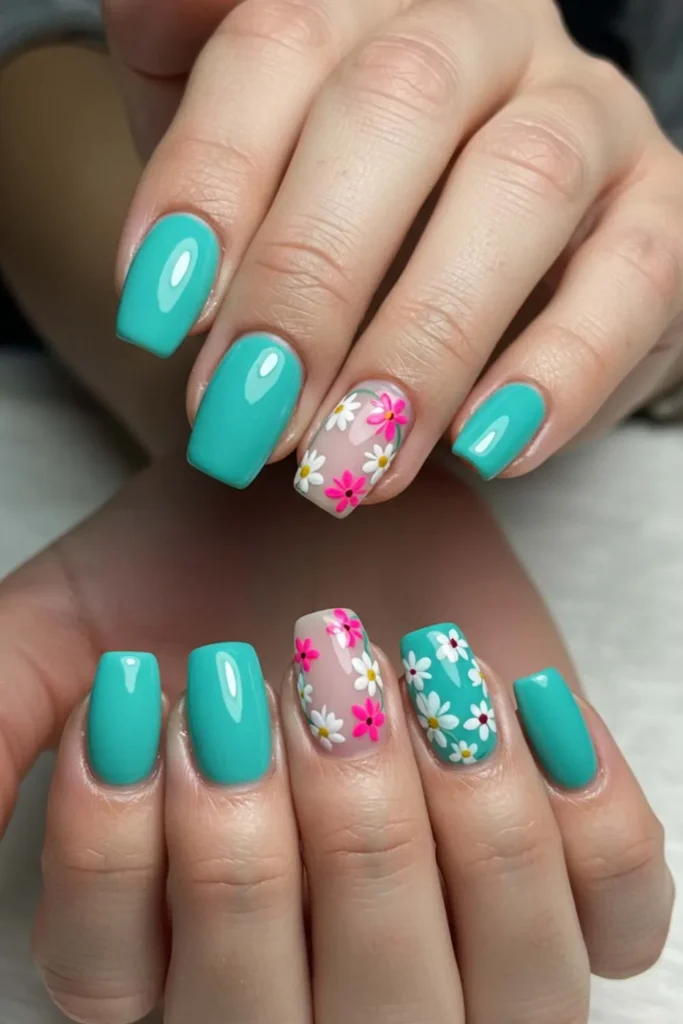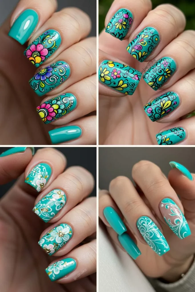 Think hand-drawn flowers instead of super polished, photo-perfect blooms. Floral doodles have this cute, artsy vibe that’s perfect for casual, everyday nails. You can mix small daisies, roses, or even tropical flowers — all on a turquoise base.