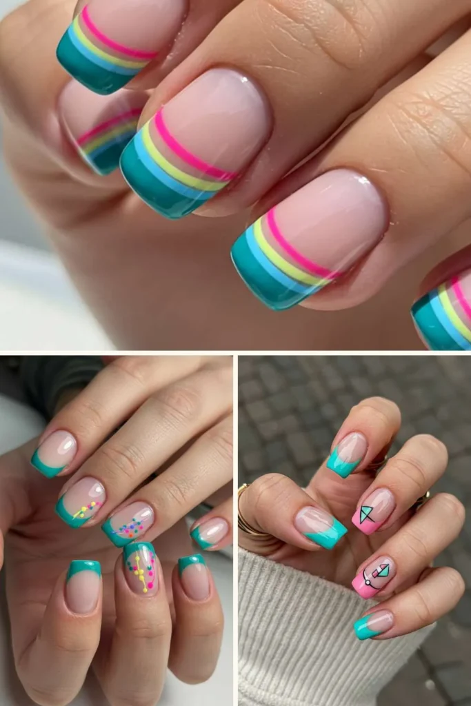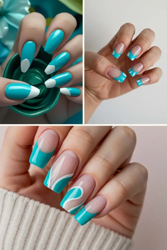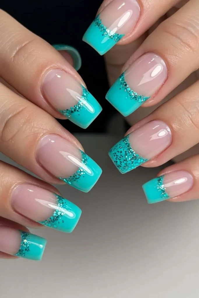 Classic French tips but make them turquoise. Add a thin line of silver or gold glitter along the smile line for that sparkle factor. This style is elegant but still playful — great for parties, date nights, or even prom night.