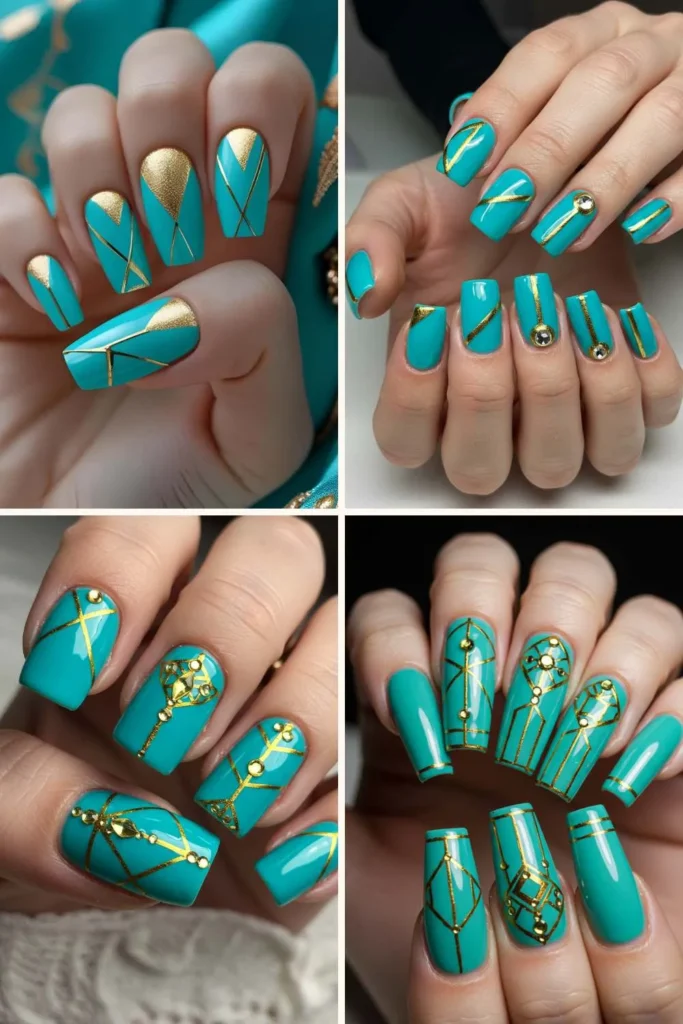 Gold lines on turquoise nails? That’s instant high-fashion energy. You can go minimalist with a single gold triangle or go bold with multiple geometric patterns.