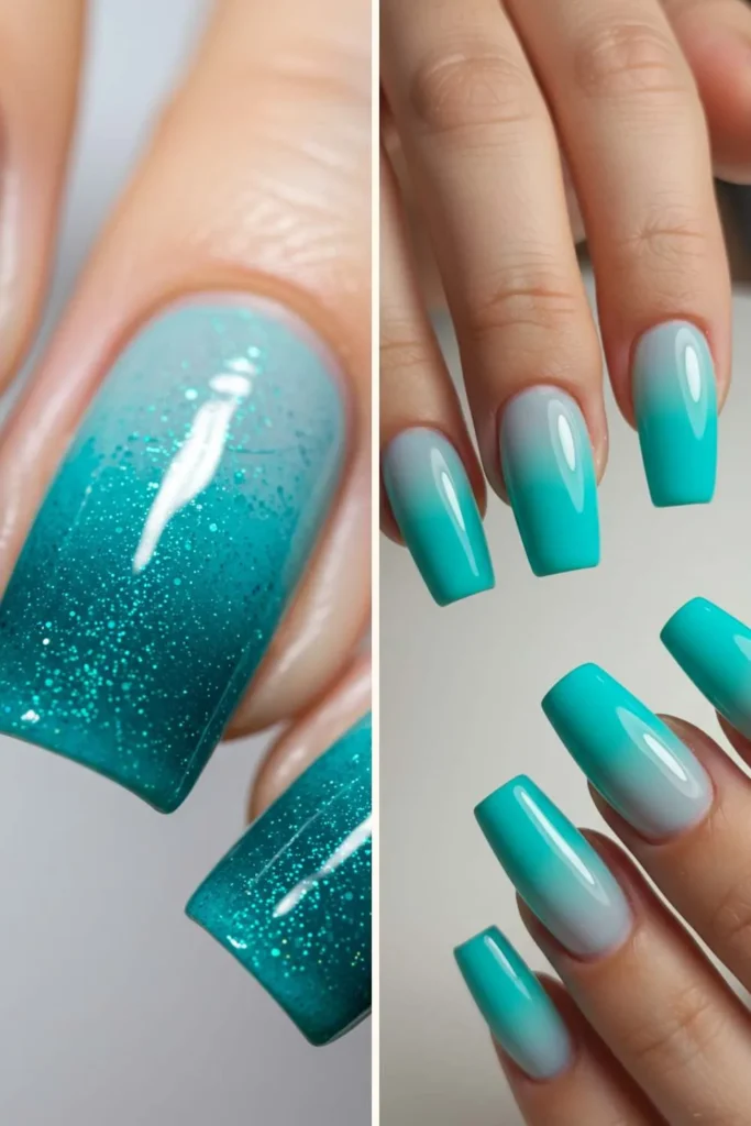 I’m obsessed with ombre nails, and turquoise ombre is next-level gorgeous. This style softly fades from a light, almost minty turquoise into a deep, oceanic teal.