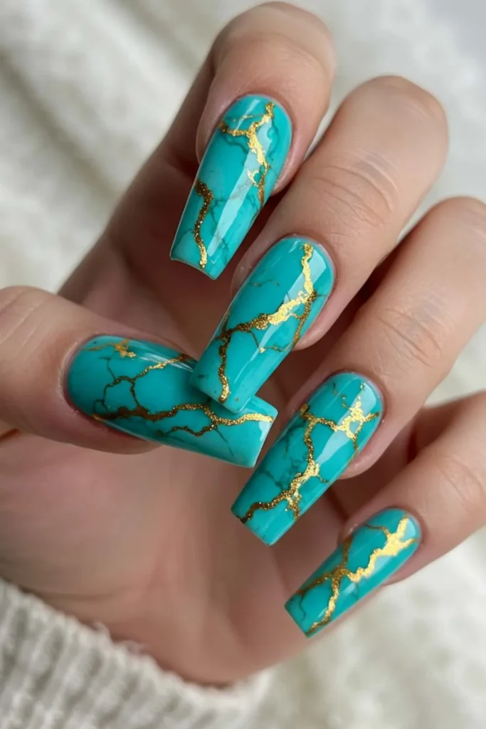 2. Turquoise Marble Nails with Gold Veins