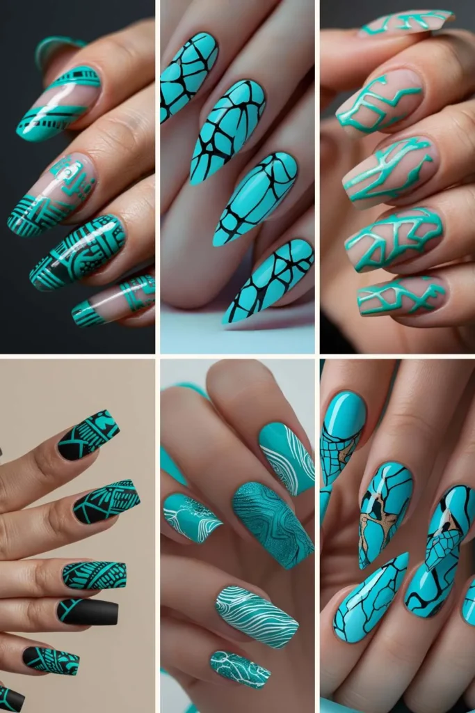 Negative space nails are so trendy right now, and turquoise patterns give them that pop of color they need. You can do geometric lines, swirls, or even mini hearts while letting part of your natural nail peek through.