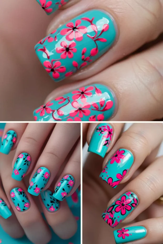 The turquoise base makes the neon pink flowers stand out beautifully, and you can do them as full floral prints or just as accents on one or two nails. This design screams vacation nails, but honestly, I’d wear it on a random Tuesday just for the serotonin boost.
