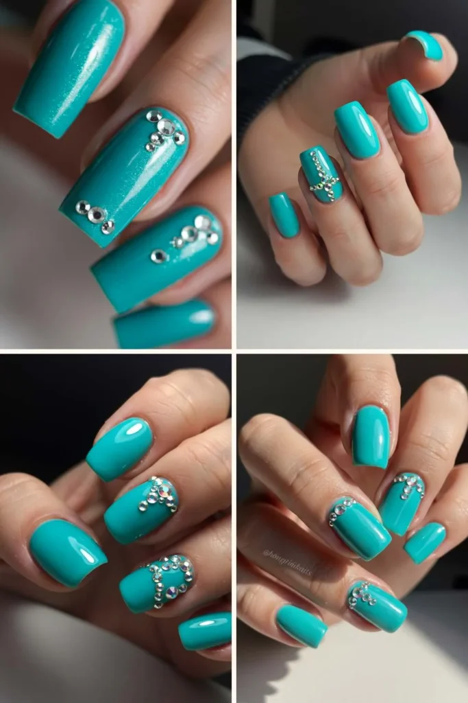 Sometimes you just need a little bling. Adding rhinestones to turquoise nails instantly transforms them into showstoppers. You can go subtle with a single gem at the base of each nail or go full glam with crystal patterns.