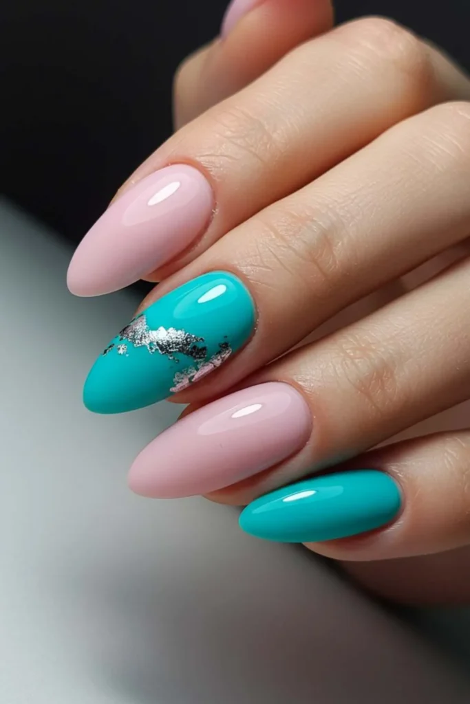 If you’re not ready for a full turquoise takeover, go for accent nails. Paint most of your nails a neutral color and make one or two nails turquoise with silver foil art. The foil gives it a metallic, almost marble-like effect that feels very “editorial fashion shoot.”