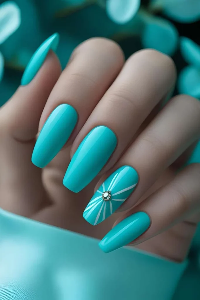 Sometimes simple just wins. A solid turquoise manicure is like that perfect summer dress — you don’t need anything extra, it just works. This style is perfect for everyday wear, vacations, or even a casual wedding guest look.